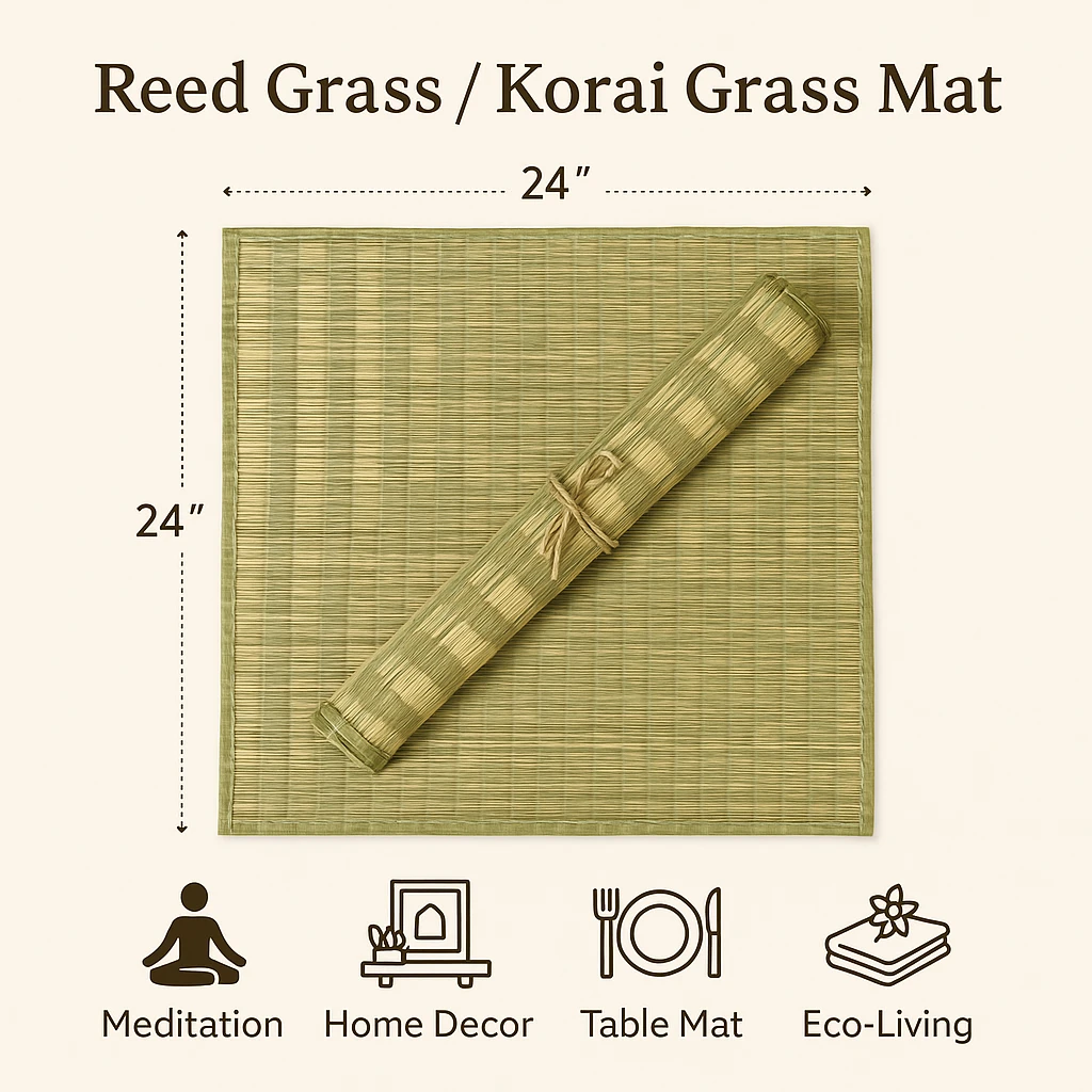 Enhance your spiritual rituals and meditation sessions with this 24×24 inch handwoven Kush Grass (Darbha Grass) Puja Asana. Traditionally used in Hindu rituals, Kush grass is known for its sacred qualities and ability to retain spiritual energy. This natural mat serves as an Aasana (seat) during pooja, mantra chanting, meditation, and yoga, helping improve mental focus and insulation from the ground’s energies.