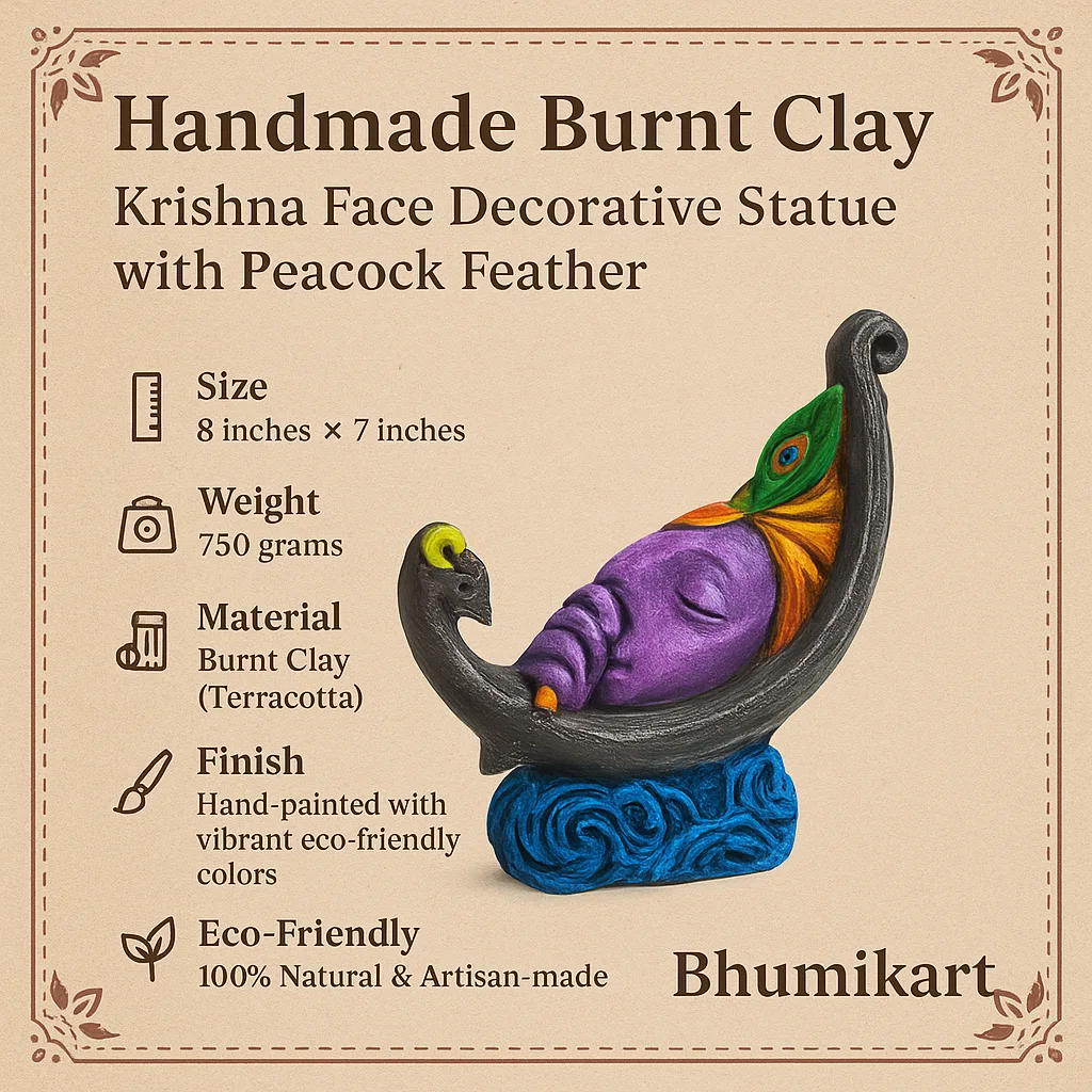 Bring home a touch of divine elegance with this exquisite handmade burnt clay Krishna decor statue. Crafted with love and precision by skilled Indian artisans, this unique piece beautifully represents Lord Krishna’s serene face adorned with a vibrant peacock feather and a flute, symbolizing peace, devotion, and harmony.