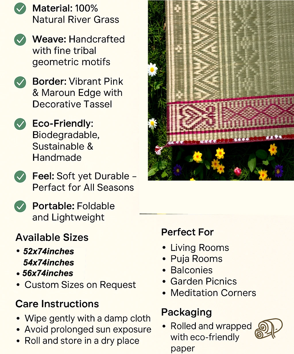 Add a touch of tradition and eco-friendly elegance to your living space with this handwoven Madurkathi grass mat, crafted by skilled artisans using natural river grass. Featuring a very unique ethnic border design, this mat blends aesthetic charm with functional comfort—perfect for your living room, bedroom, yoga space, or pooja room.