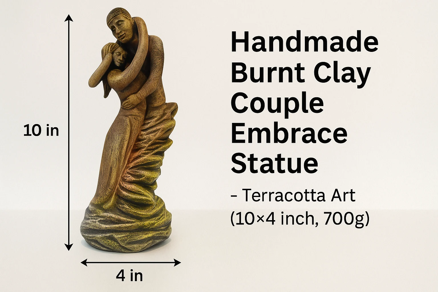 Handmade burnt clay couple embrace statue crafted in terracotta. Eco-friendly, 10×4 inch, 700g – a perfect décor piece and gift symbolizing love & togetherness.